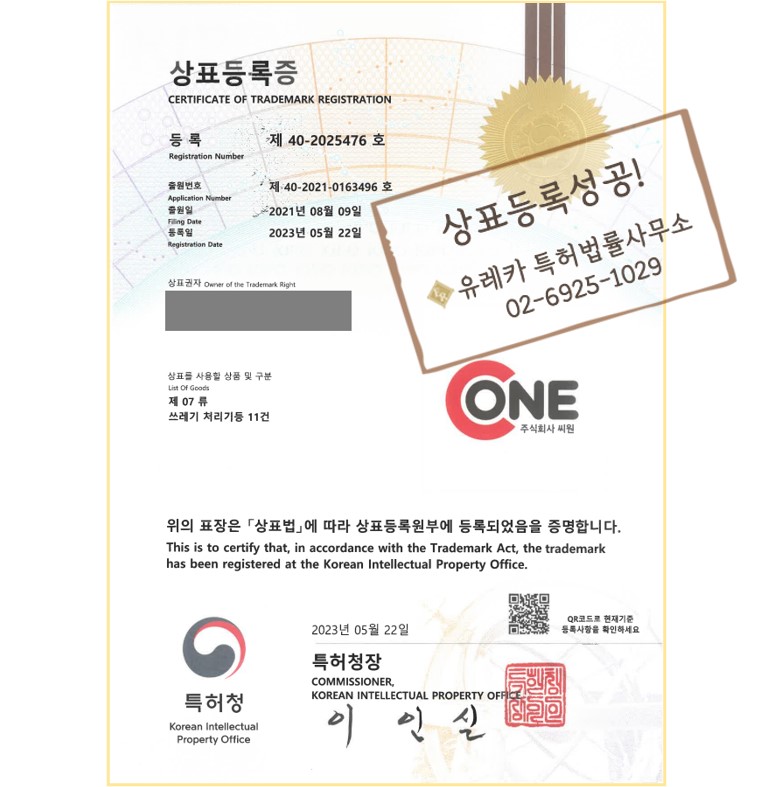 음식물 처리기, 쓰레기처리기, 재활용, 쓰레기분쇄기 "(logo) CONE 주식회사 씨원" 유레카에서 상표등록 완료!