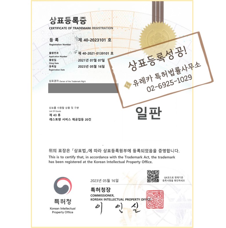 카페, 양식,레스토랑,테이크아웃 / 레스토랑 서비스 제공업 "일판" 유레카에서 상표등록 완료!