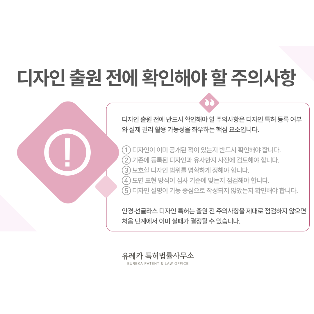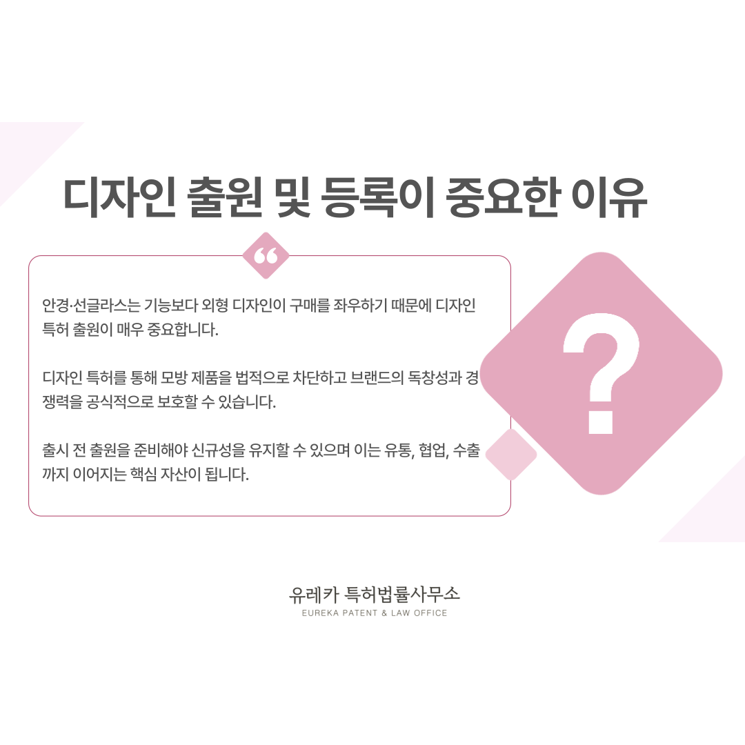 특히 안경·선글라스는 프레임 형태와 비율이 비슷한 디자인이 많아 선행 디자인 조사가 필수입니다.