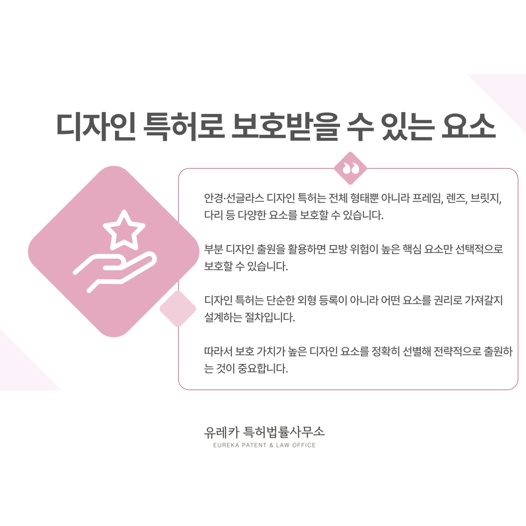 디자인 특허로 보호받을 수 있는 안경·선글라스 요소는 생각보다 매우 다양합니다.