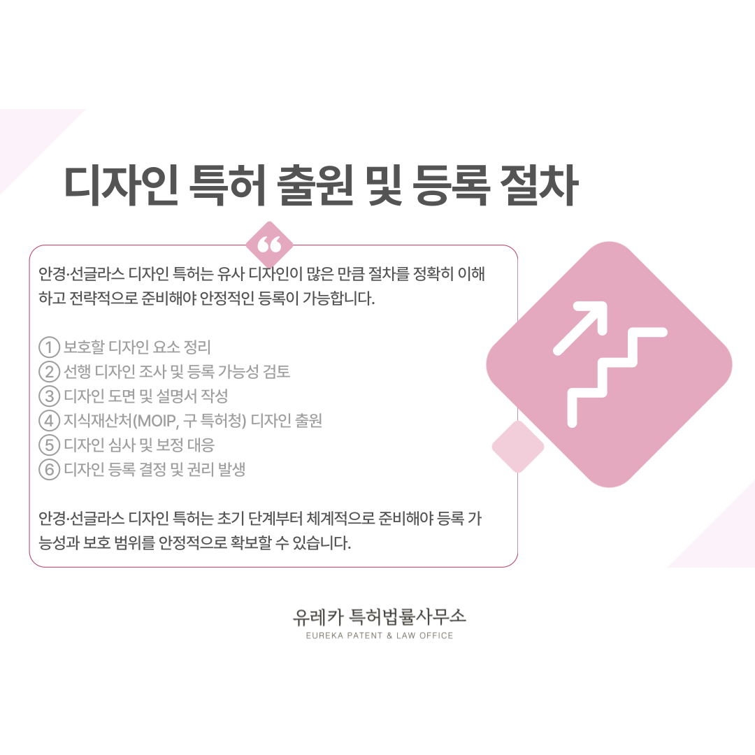 이와 같은 안경·선글라스 디자인 특허 출원 및 등록 절차는 단계별 준비가 결과에 큰 영향을 미칩니다.