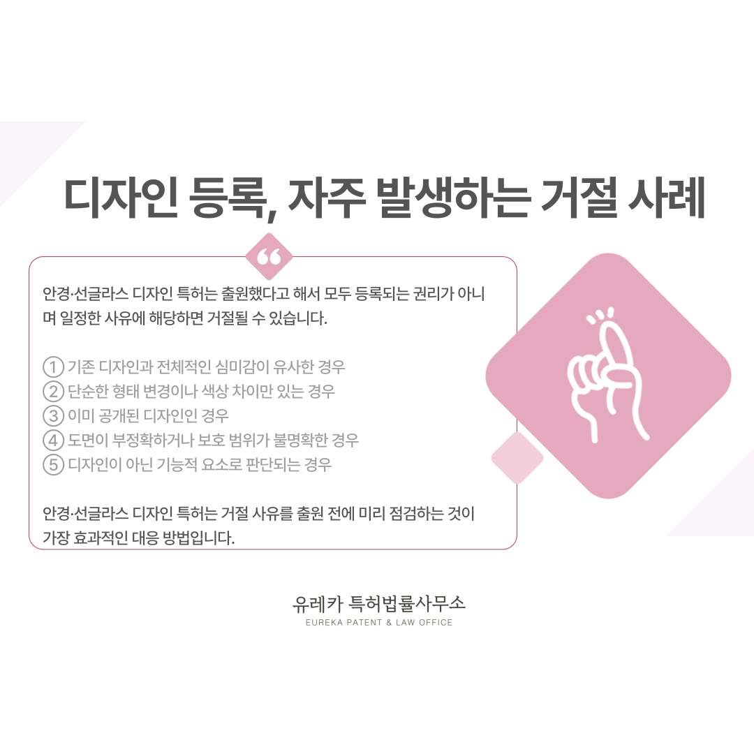 이처럼 안경·선글라스 디자인 특허는 거절 사유가 비교적 명확하게 존재합니다.