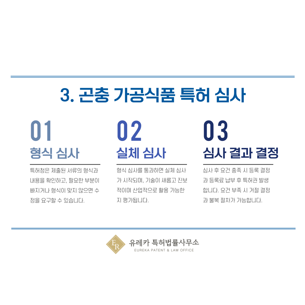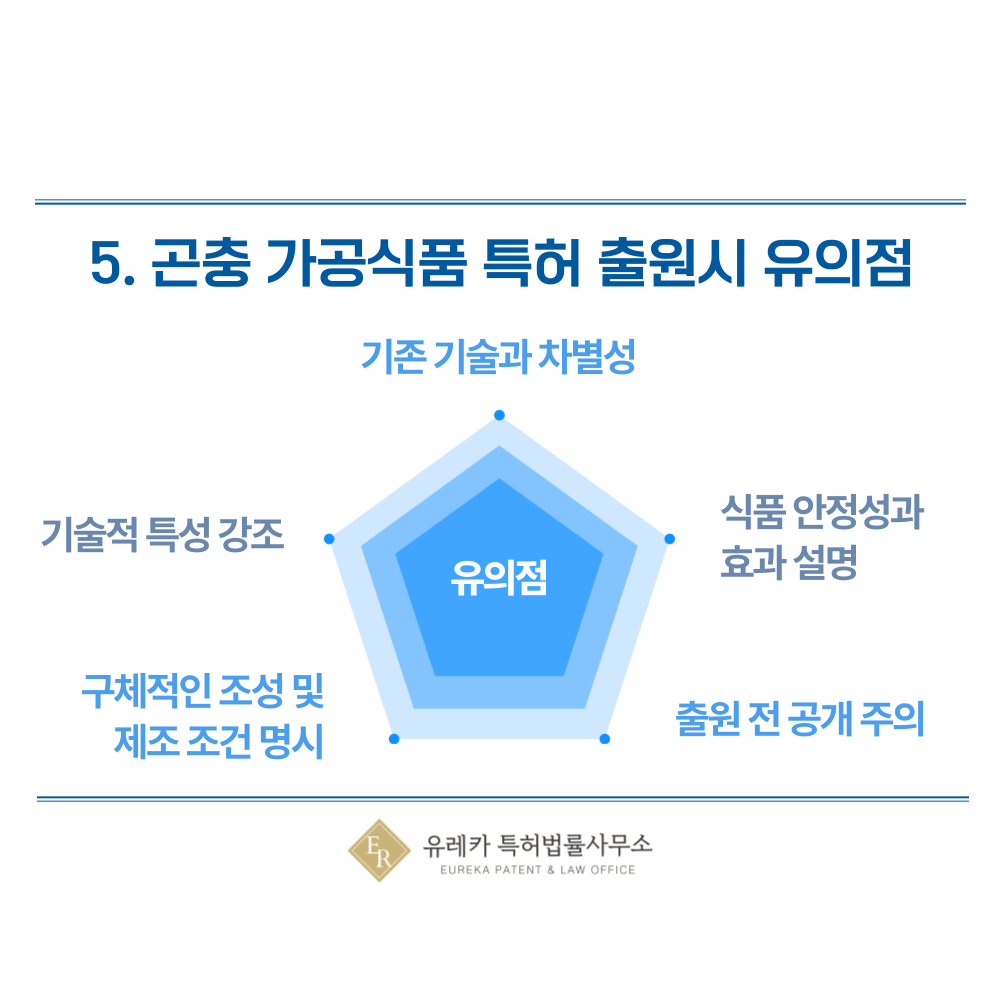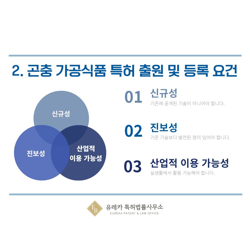 단순히 곤충을 활용한 조리법보다는, 가공 방식, 추출 기술, 영양소 보존법, 냄새 제거 공정 등과 같은 기술적인 부분이 특허 심사의 핵심이 됩니다. 곤충을 재료로 사용하는 것 자체는 특허 대상이 아니므로 기술적인 차별성을 부각시켜야 합니다.