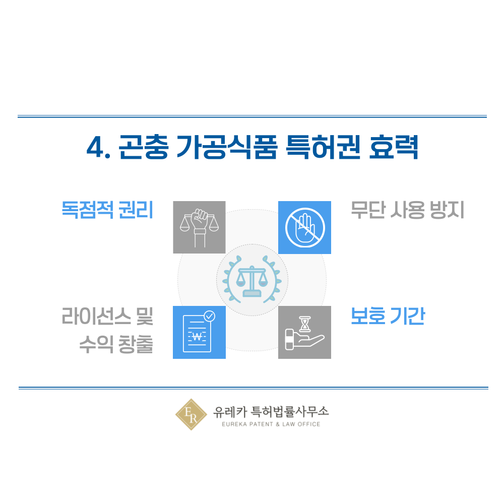 특허가 등록되면 해당 곤충 식품 기술에 대해 출원인이 독점적으로 사용할 수 있는 권리가 생깁니다. 조성, 가공 방식, 활용 방법 등을 다른 사람은 마음대로 사용할 수 없게 되는 것입니다.