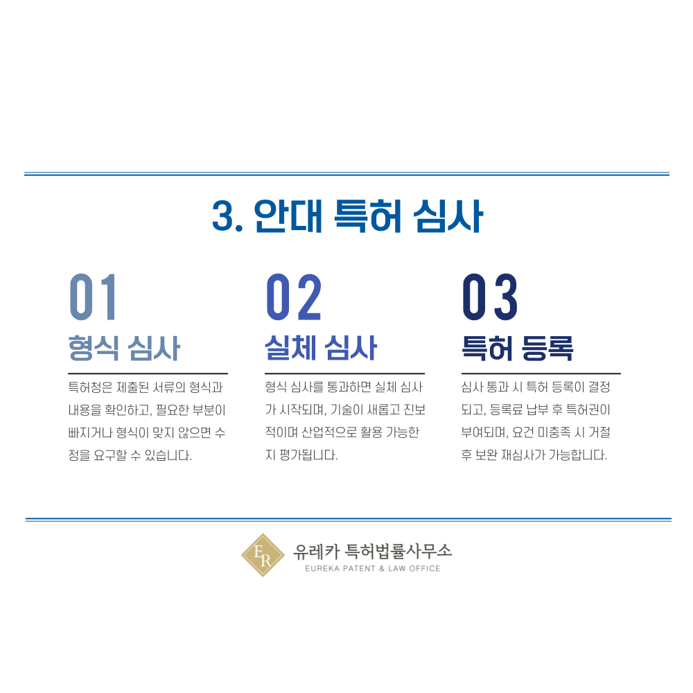 특허청 심사관이 안대 기술이 신규성, 진보성, 산업적 이용 가능성을 충족하는지 평가해요. 기존 기술과 비교해 차별성이 부족하면 보완 요청을 받을 수도 있어요.