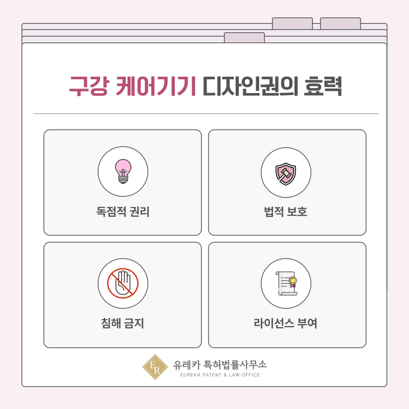 칫솔, 구강 세정기, 치주 관리기 등 제품 외형이 경쟁력인 분야에서는 매우 중요한 권리로 작용합니다.