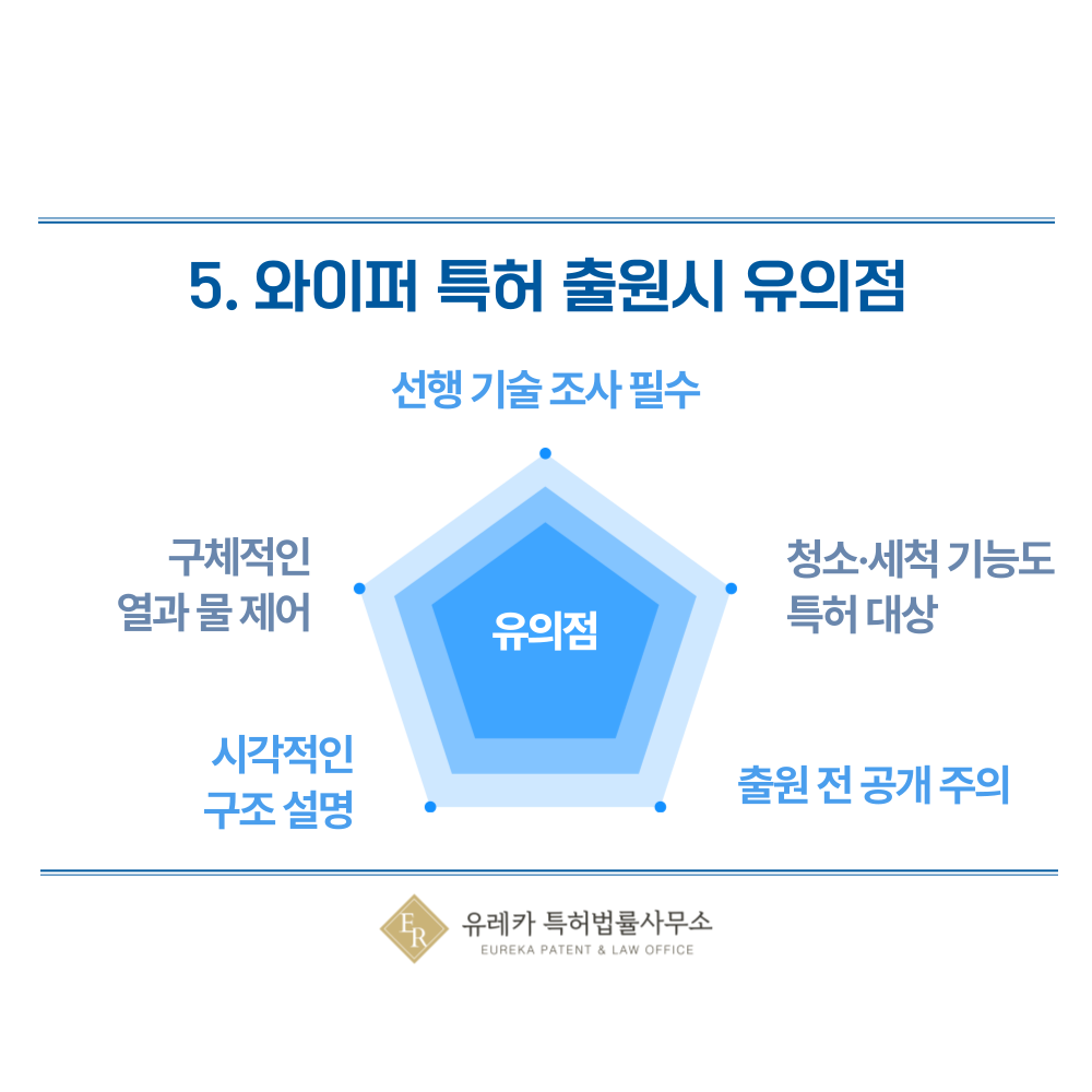 와이퍼 기술이 기존 제품과 어떻게 다르고 어떤 개선점이 있는지를 명확하게 표현해야 합니다. 단순한 모양 변경이나 일반적인 조합은 특허로 인정되기 어렵기 때문에, 구조적·기능적 차별성이 눈에 띄도록 기술적 특징을 강조해야 합니다.