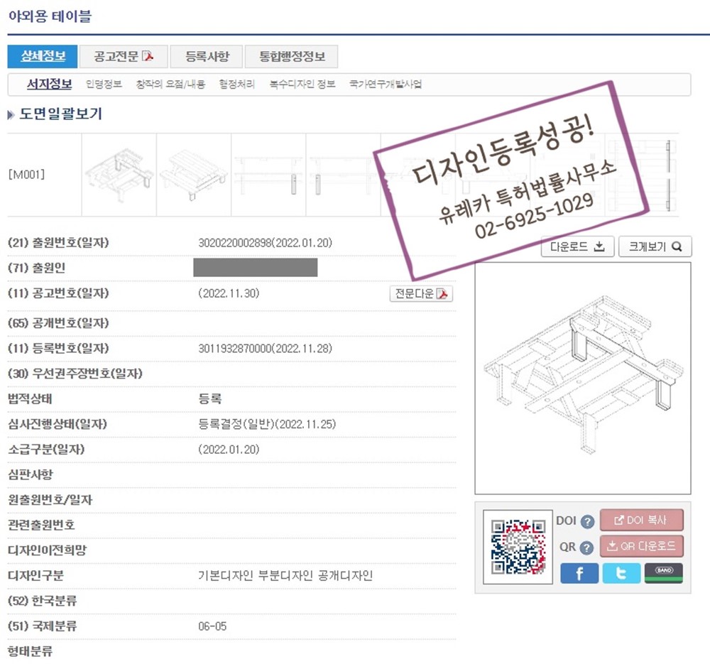 "야외용 테이블" 유레카에서 디자인등록 완료!