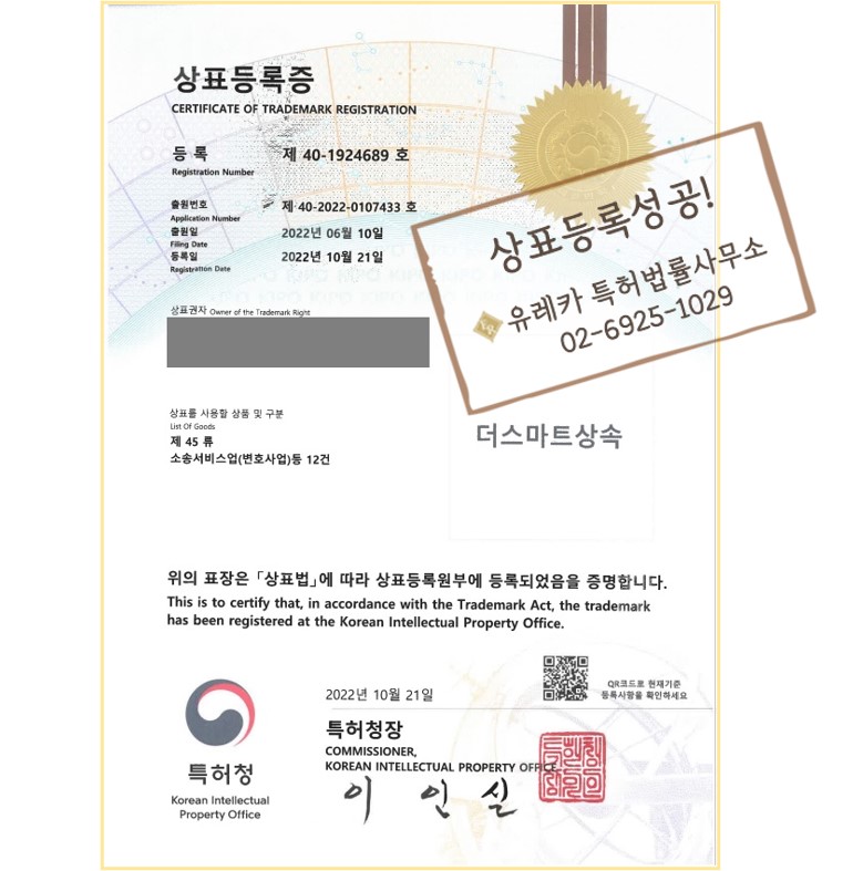 소송서비스업(변호사업) "더스마트상속" 유레카에서 상표등록 성공!