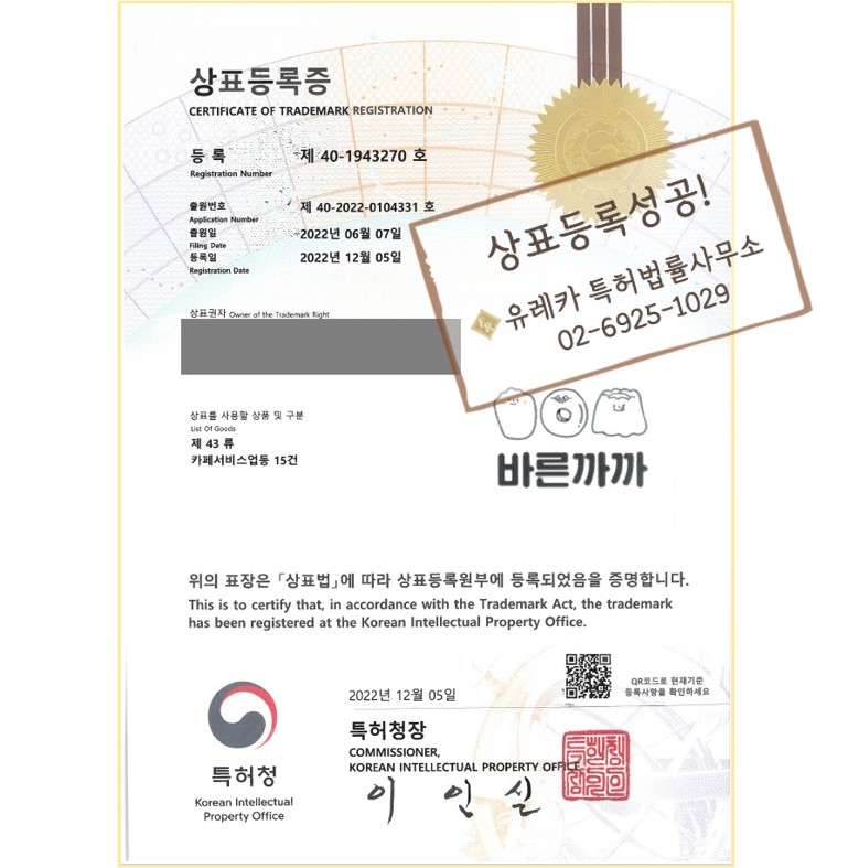 합성첨가제가 안들어간 건강 디저트류 카페업 "(logo)바른까까" 유레카에서 상표등록 완료!