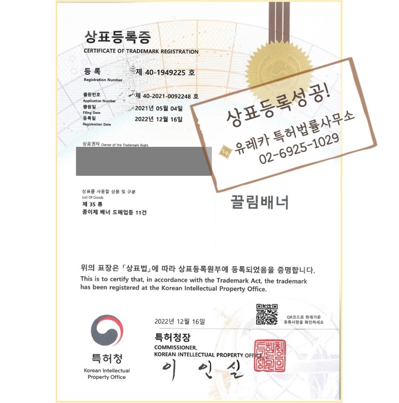 배너, 간판 도/소매업 상표등록을 유레카에서 진행하여 성공적으로 완료하였습니다!