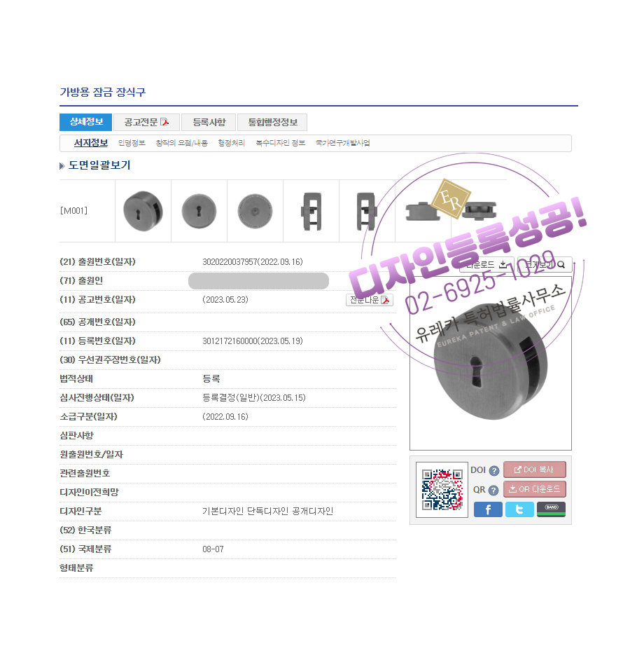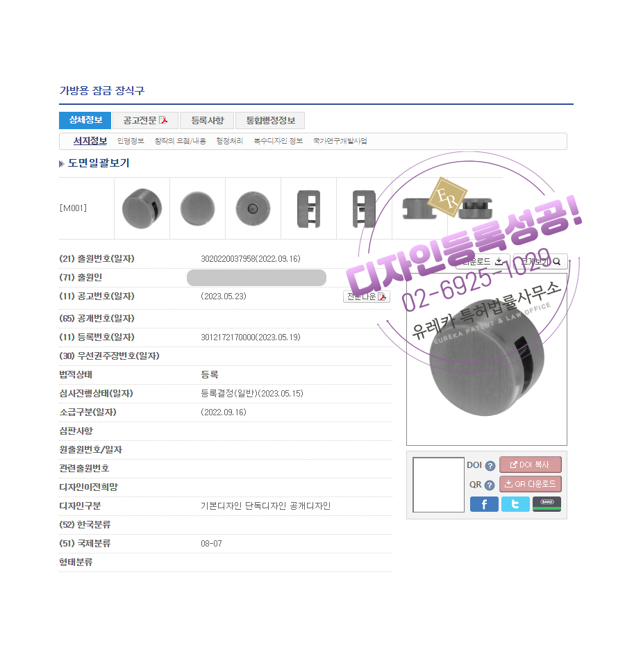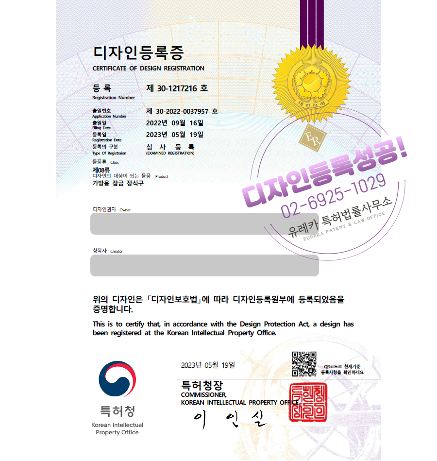유레카특허법률사무소를 통해 디자인등록이 완료되었습니다.