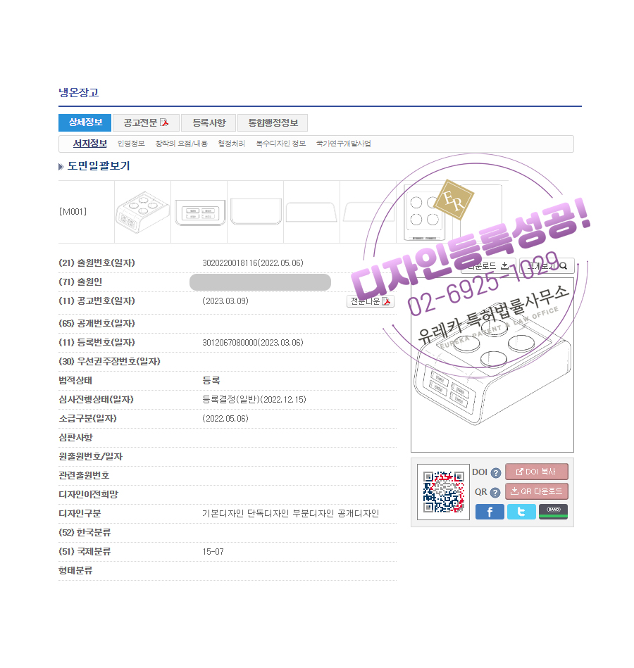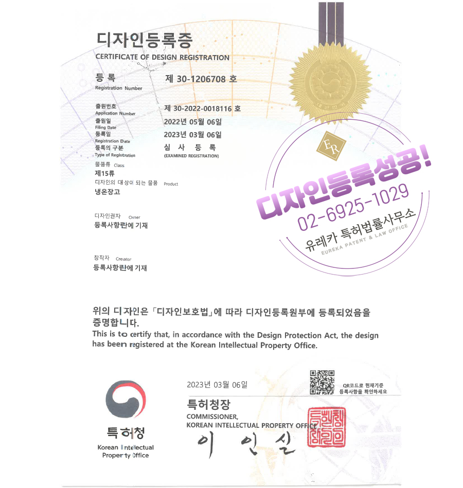 유레카특허법률사무소를 통해 디자인등록이 완료되었습니다.