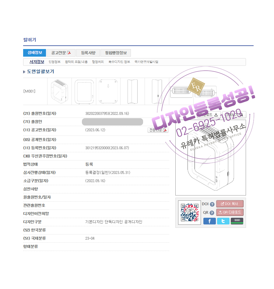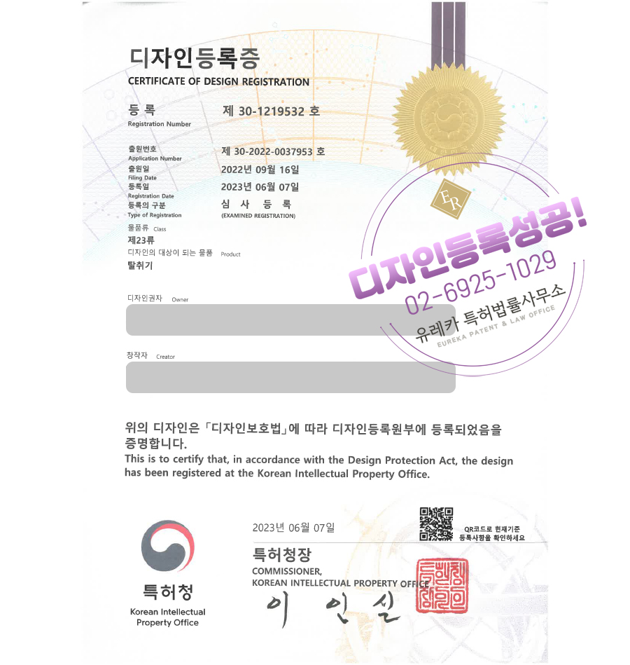 유레카특허법률사무소를 통해 디자인등록이 완료되었습니다.
