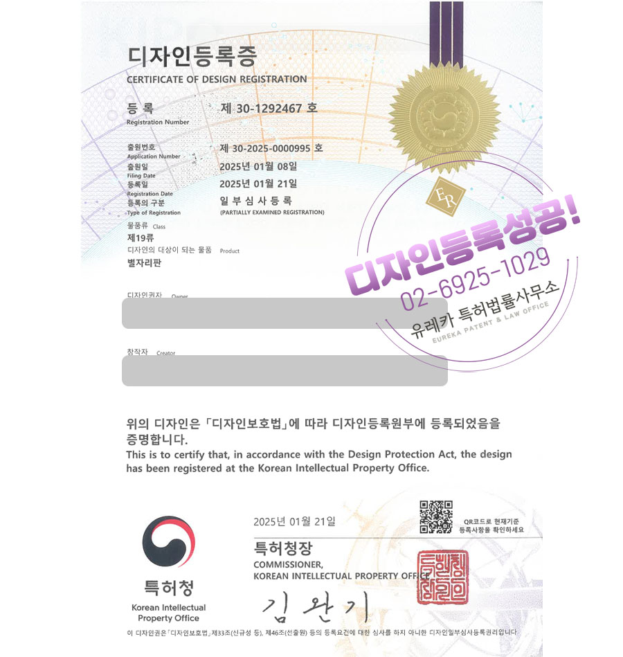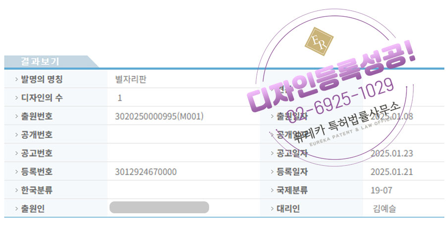 유레카특허법률사무소를 통해 디자인등록이 완료되었습니다.