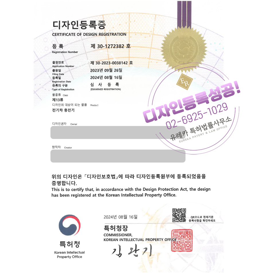 유레카특허법률사무소를 통해 디자인등록이 완료되었습니다.