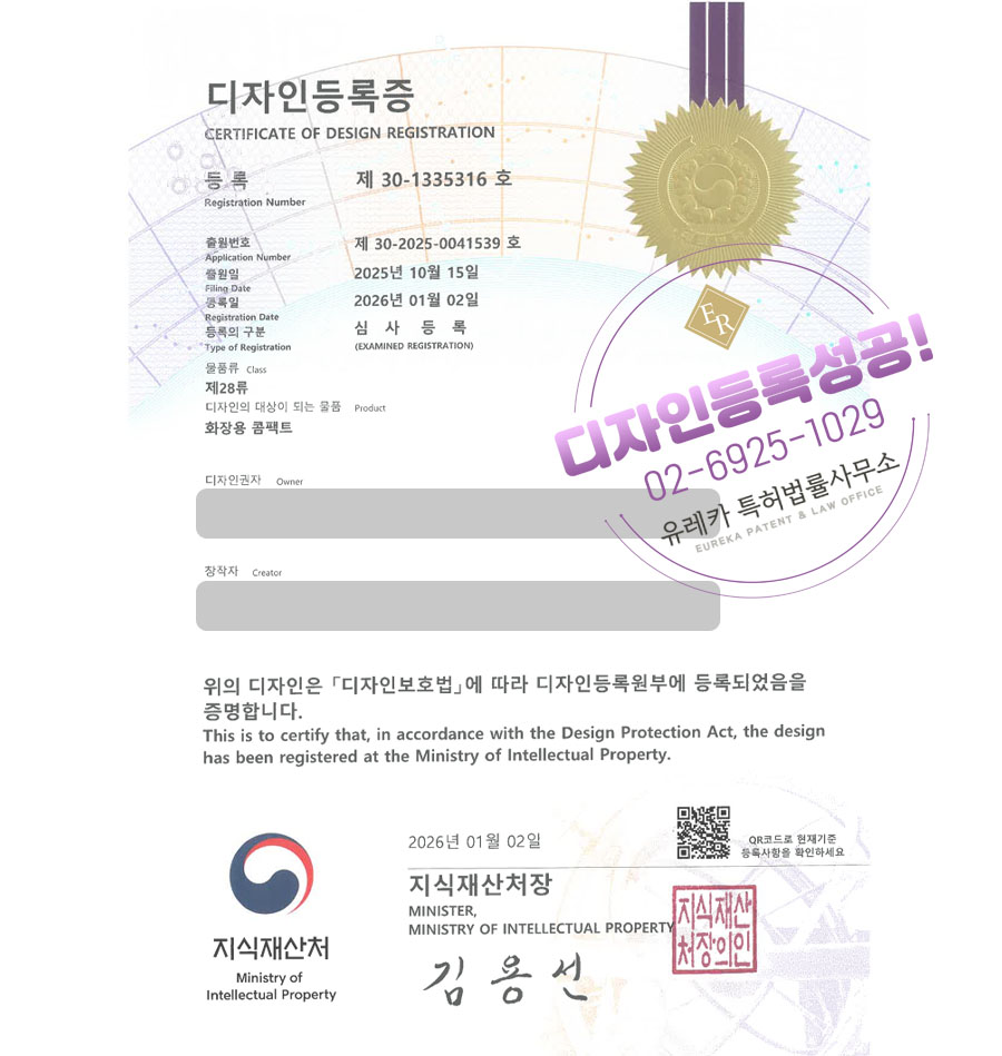 유레카 디자인등록성공ㅣ메이크업, 파우더용기, 화장품케이스 디자인 출원 “화장용 콤팩트” 디자인권 특허 등록