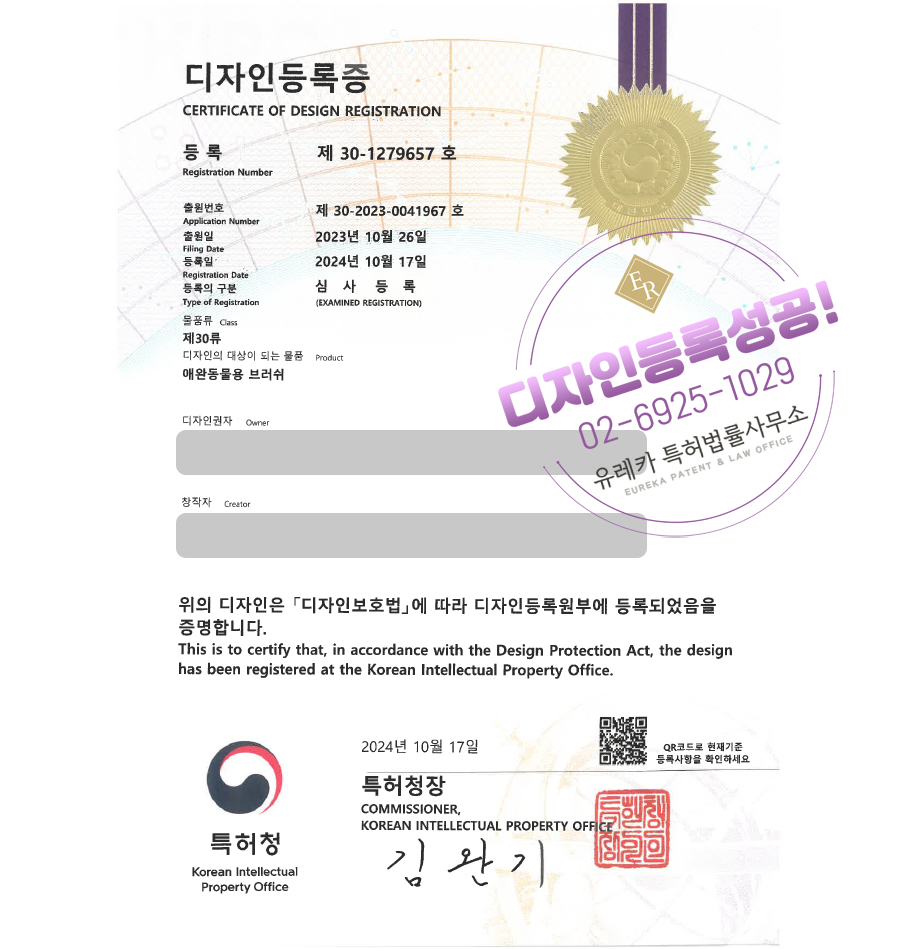 유레카특허법률사무소를 통해 디자인등록이 완료되었습니다.