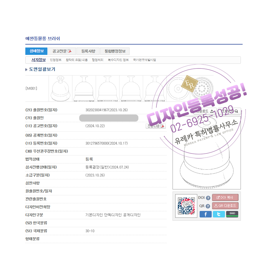디자인심사를 통과해 최종적으로 애완동물용 브러쉬 디자인등록되었습니다!