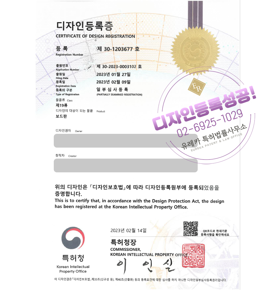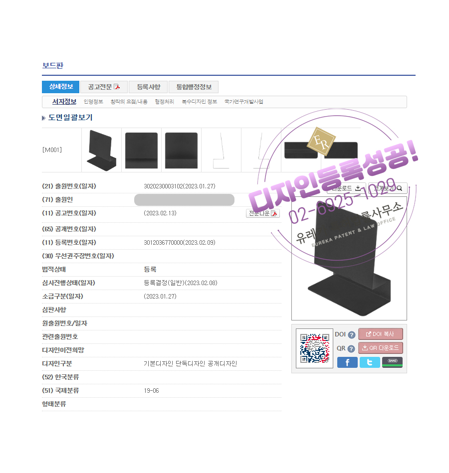 유레카특허법률사무소를 통해 디자인등록이 완료되었습니다.