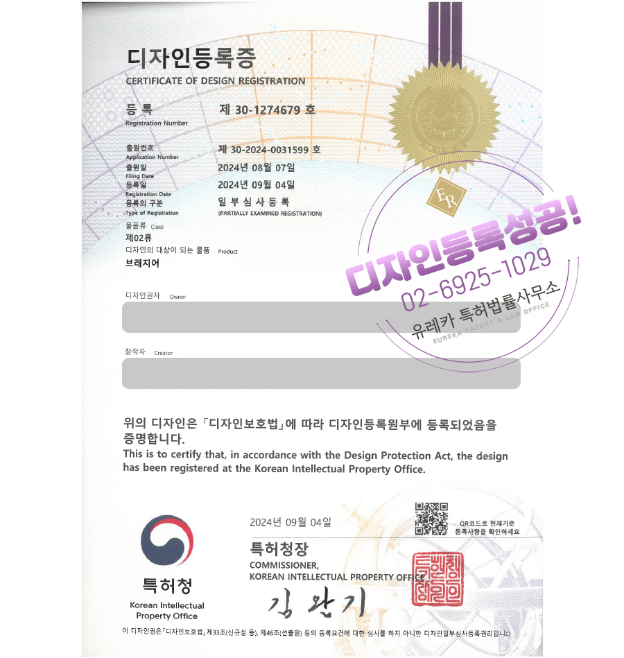유레카특허법률사무소를 통해 디자인등록이 완료되었습니다.