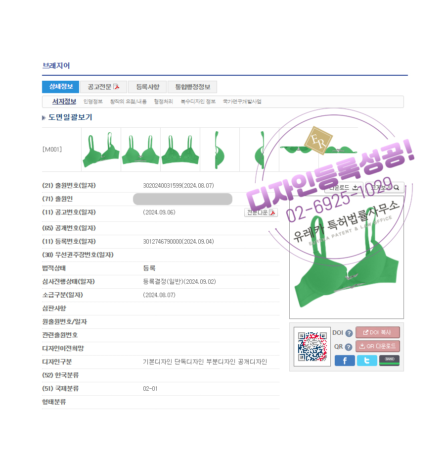 디자인심사를 통과해 최종적으로 브래지어 디자인등록되었습니다!