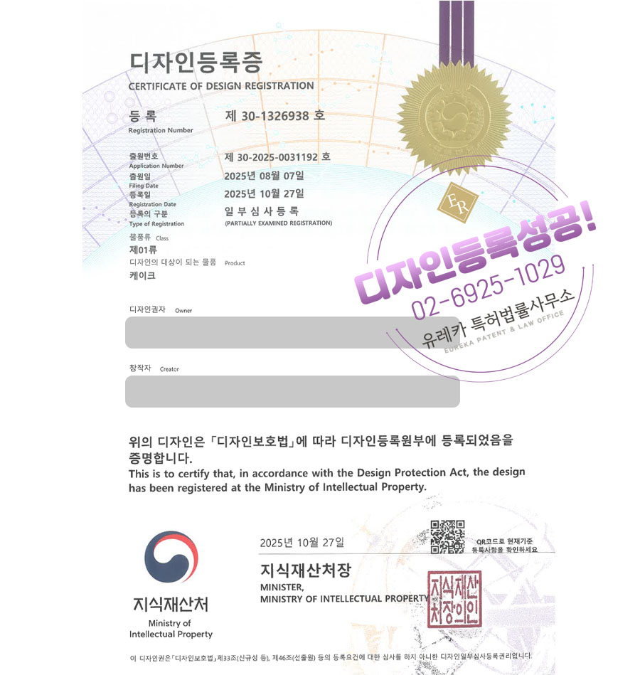 유레카 디자인등록성공ㅣ안양 디자인, 케이크 상자, 케이크 장식 디자인 출원 “케이크” 디자인권 특허 등록