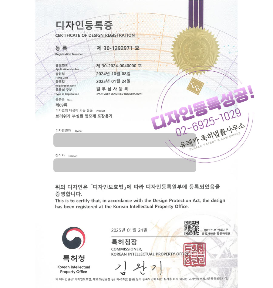 유레카특허법률사무소를 통해 디자인등록이 완료되었습니다.