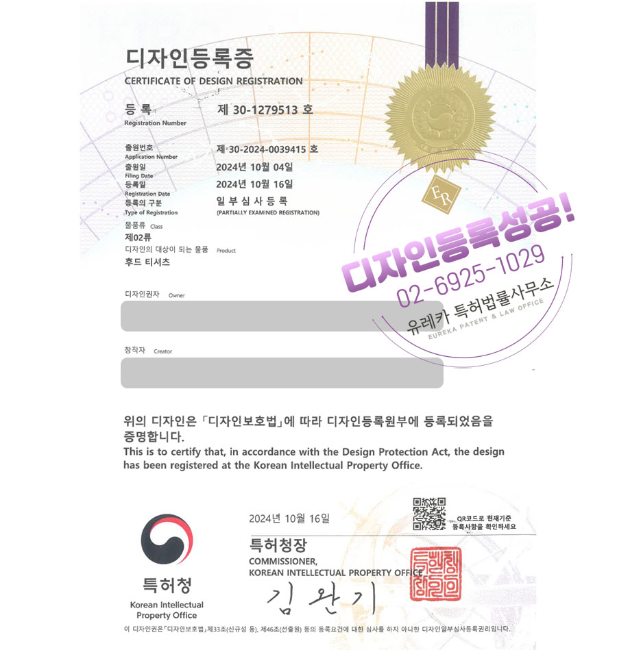 유레카특허법률사무소를 통해 디자인등록이 완료되었습니다.