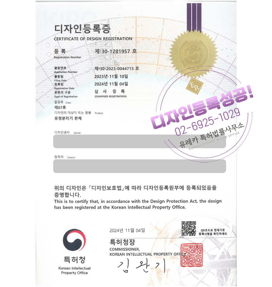 유레카특허법률사무소를 통해 디자인등록이 완료되었습니다.