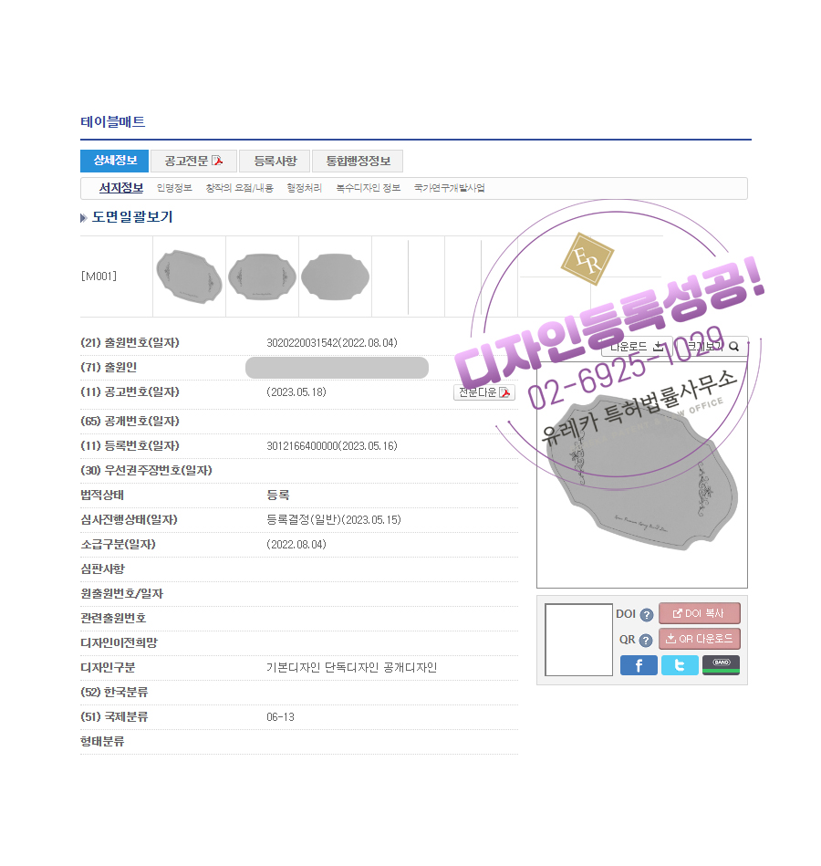 디자인심사를 통과해 최종적으로 테이블매트 디자인등록되었습니다!