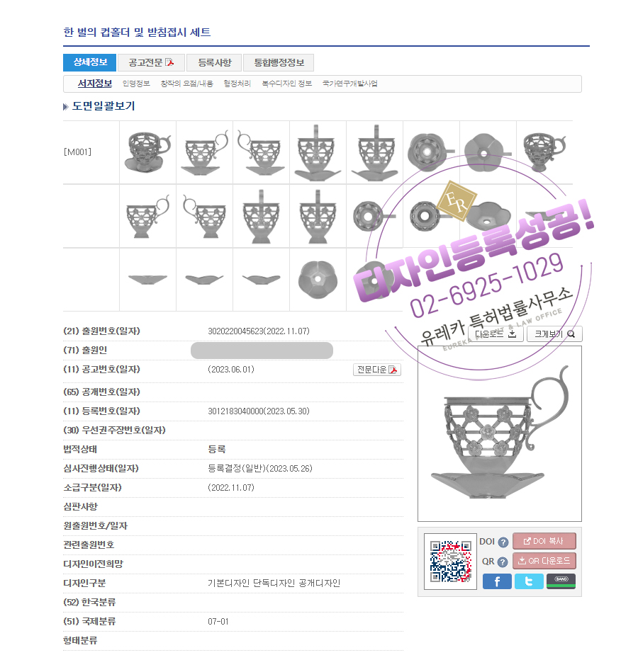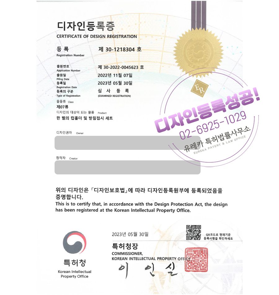 유레카특허법률사무소를 통해 디자인등록이 완료되었습니다.
