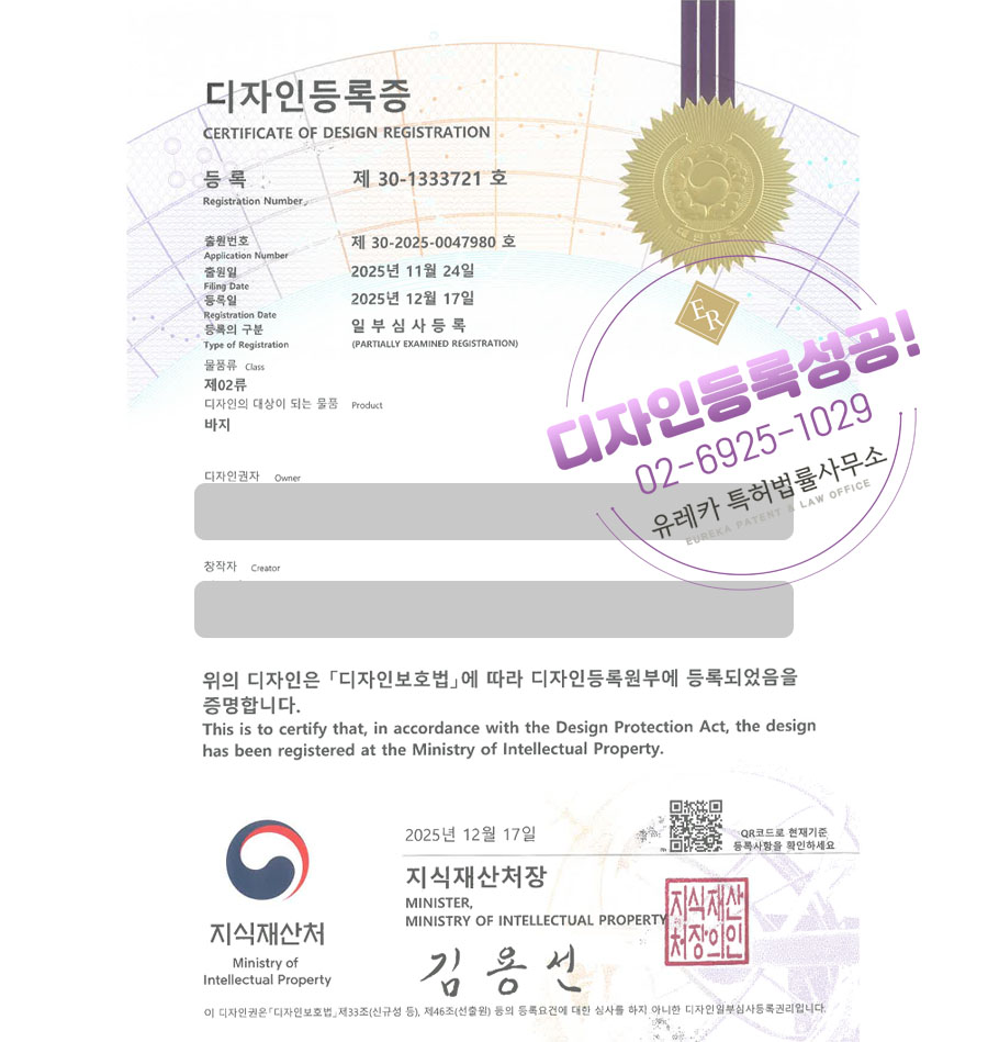 유레카 디자인등록성공ㅣ하의, 팬츠, 운동복 디자인 출원 “바지” 디자인권 특허 등록