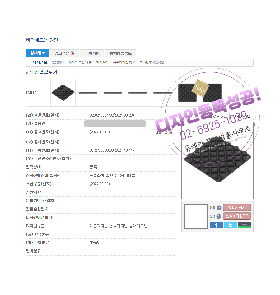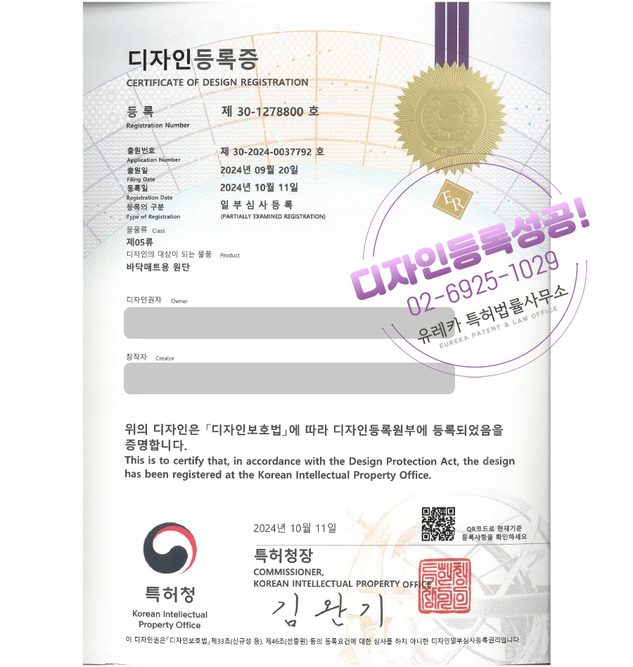 유레카특허법률사무소를 통해 디자인등록이 완료되었습니다.