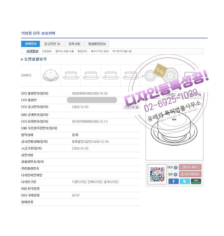 유레카특허법률사무소를 통해 디자인등록이 완료되었습니다.