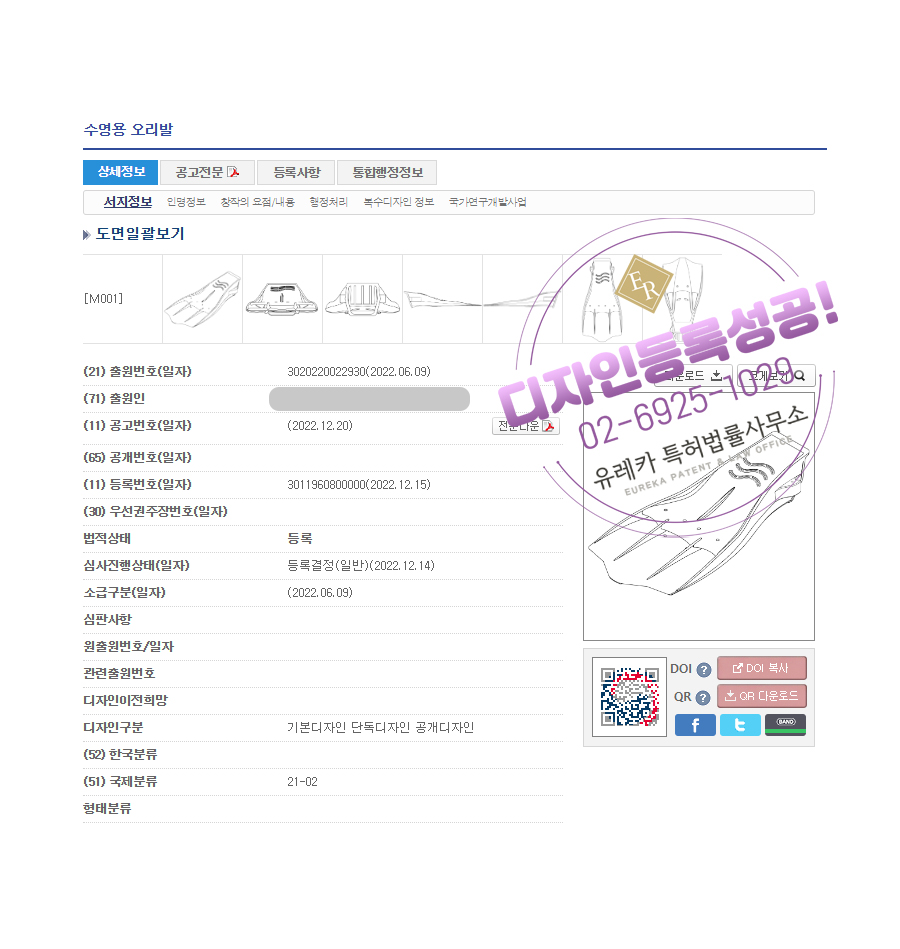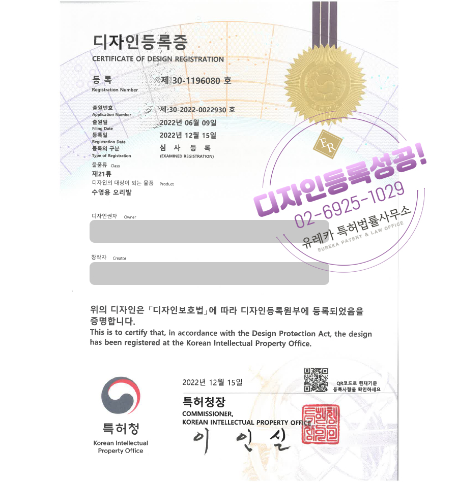 유레카특허법률사무소를 통해 디자인등록이 완료되었습니다.