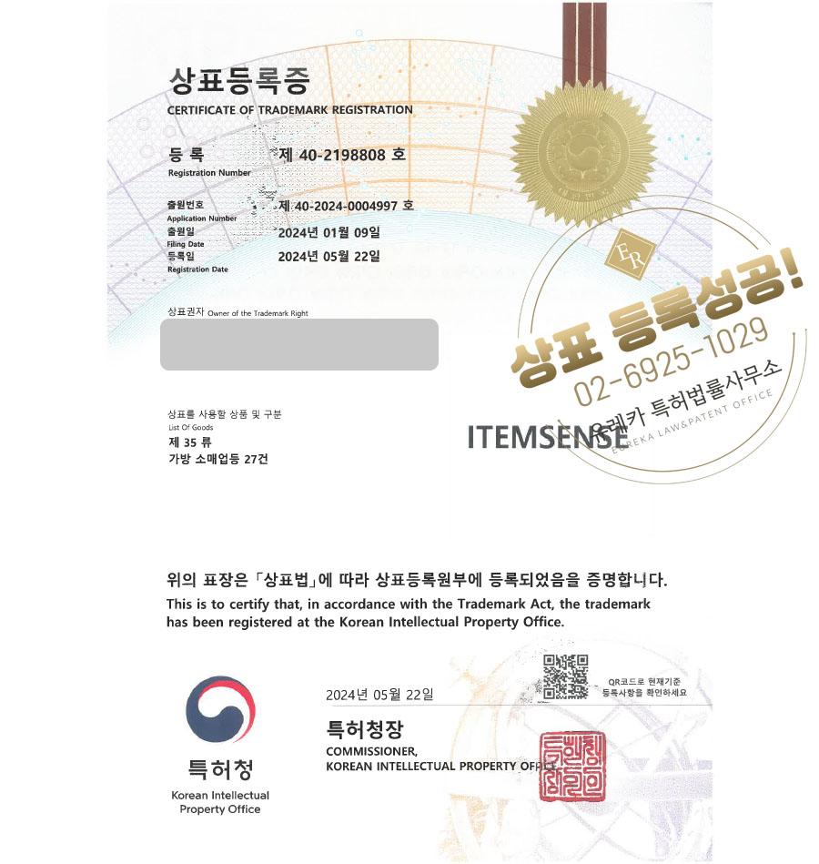 상표심사를 통과하여, 최종적으로 35류 상표등록에 성공하였습니다!