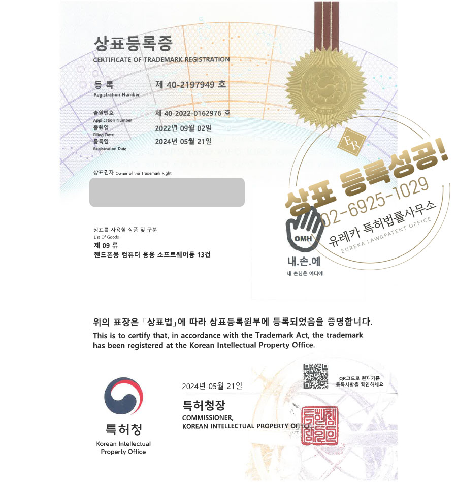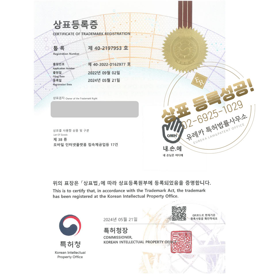 상표심사를 통과하여, 최종적으로 09류, 38류 상표등록에 성공하였습니다!