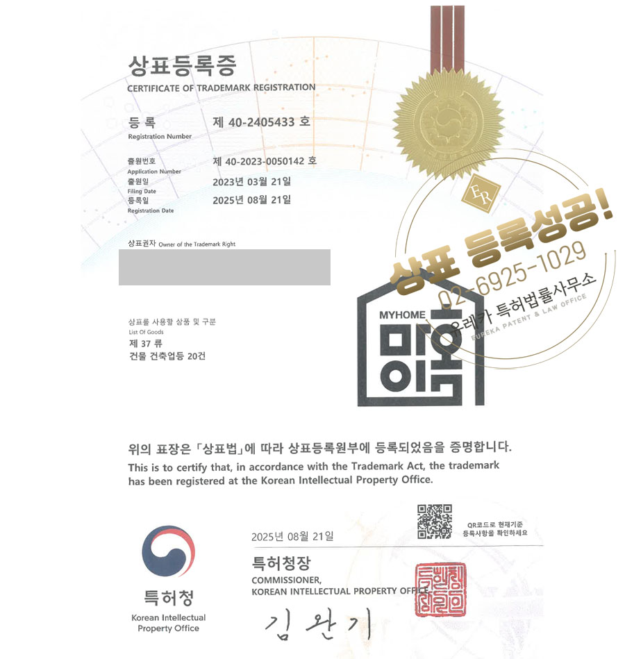 유레카 상표등록성공! 건축업, 리모델링, 인테리어 상표 특허 출원 “마이홈” 상표권 디자인 등록