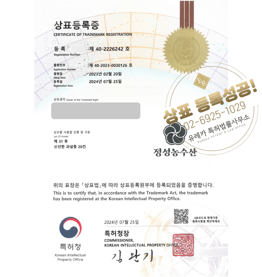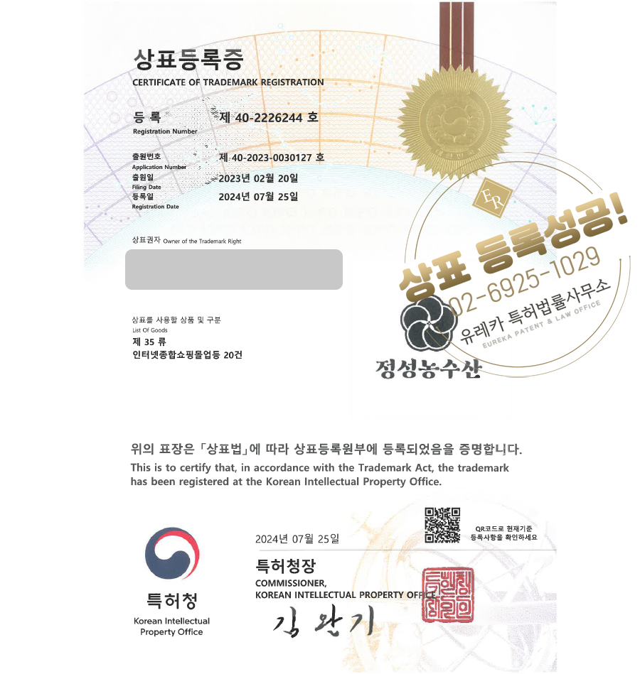 상표심사를 통과하여, 최종적으로 31류, 35류 상표등록에 성공하였습니다!
