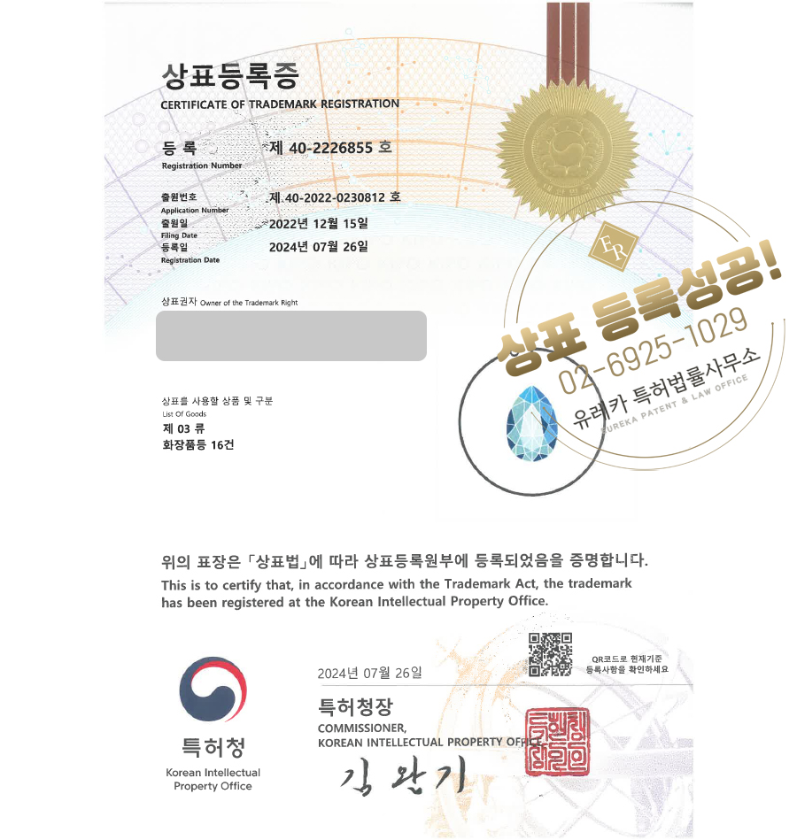상표심사를 통과하여, 최종적으로 03류 상표등록에 성공하였습니다!