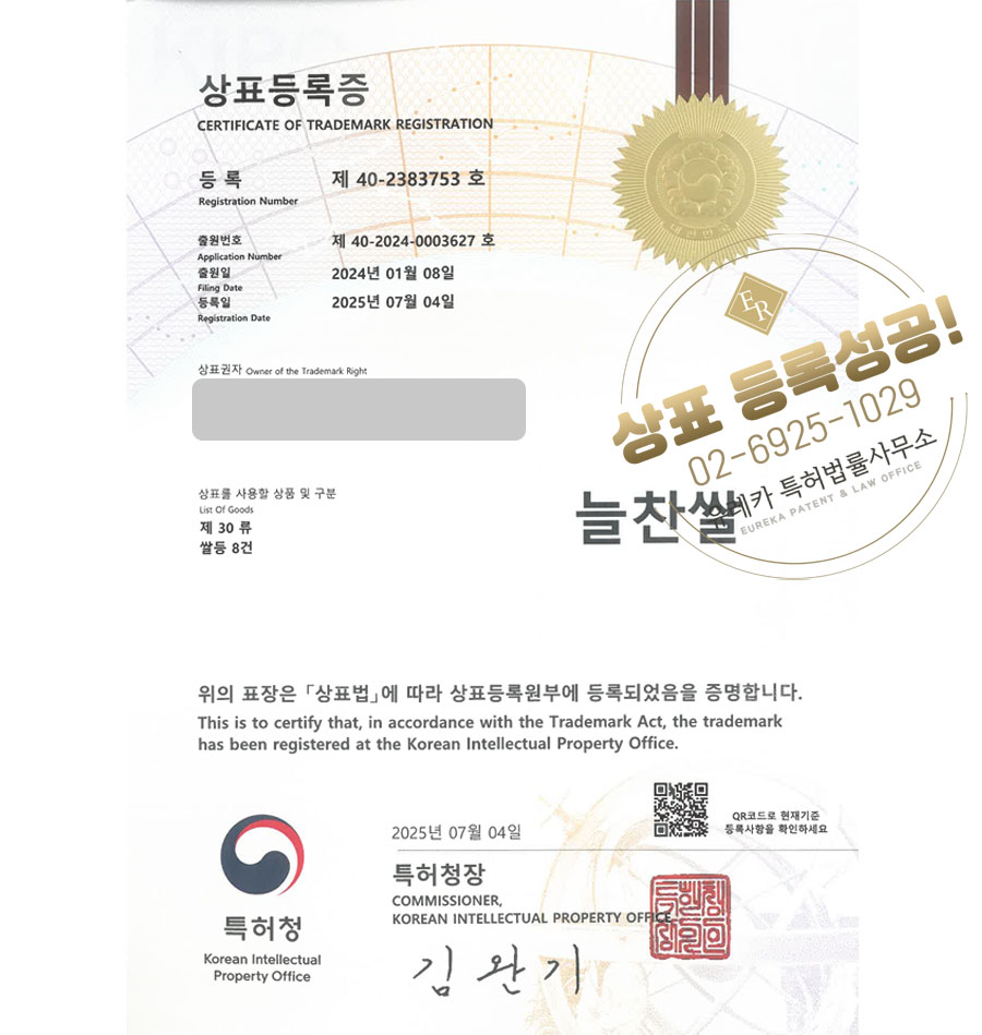 상표심사를 통과하여, 최종적으로 30류 상표등록에 성공하였습니다!