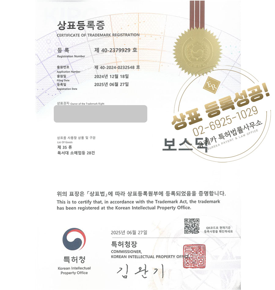 상표심사를 통과하여, 최종적으로 35류 상표등록에 성공하였습니다!