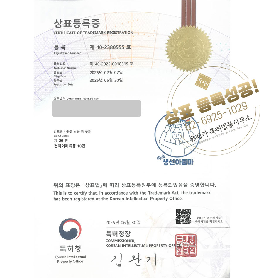 상표심사를 통과하여, 최종적으로 29류 상표등록에 성공하였습니다!