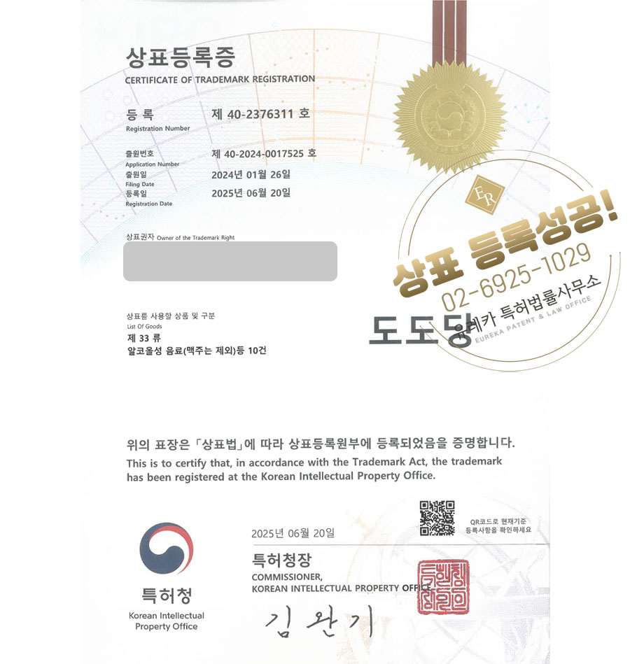 유레카 상표등록성공! 술, 주류, 쇼핑몰, 마켓, 상사, 막걸리, 동동주, 탁주, 청주, 전통주, 맥주, 소주, 와인, 샴페인 상표 특허 출원 “도도당” 상표권 디자인 등록