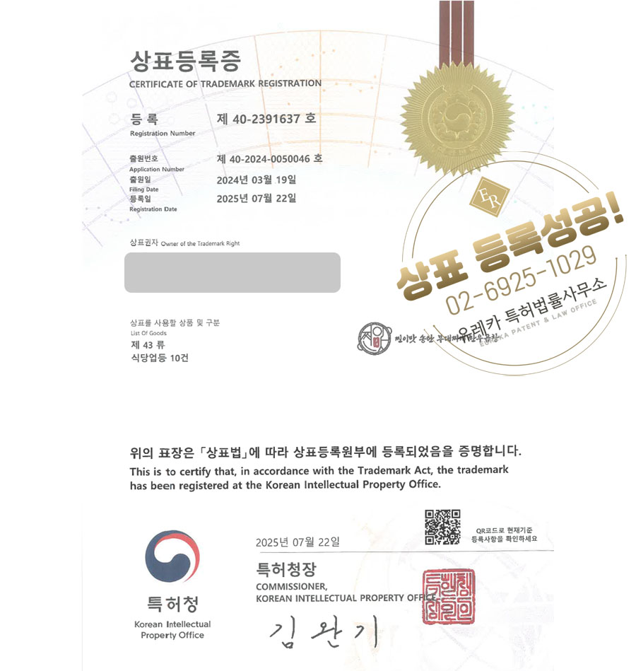 유레카 상표등록성공! 식당, 음식점, 한식, 프랜차이즈, 배달 상표 특허 출원 “찐이맛 송탄 부대찌개 한우곱창” 상표권 디자인 등록