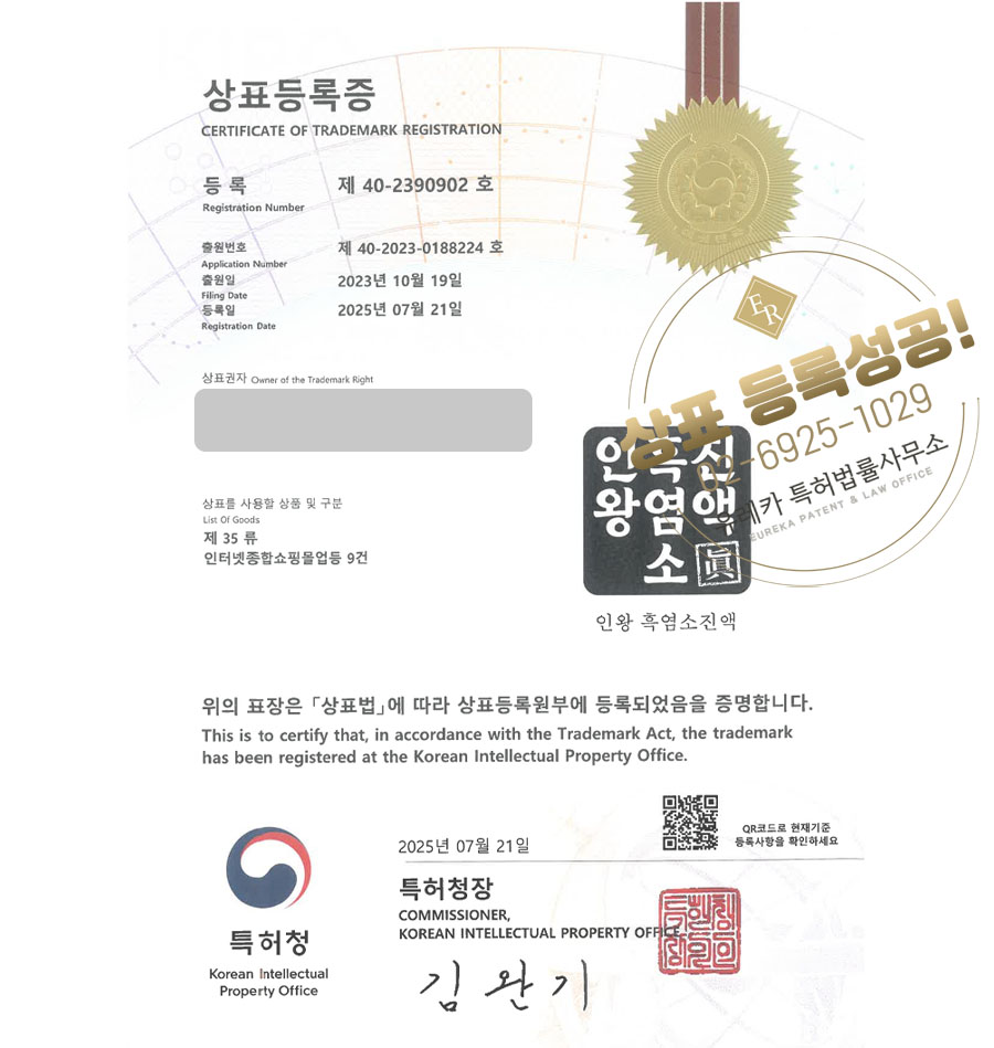 유레카 상표등록성공! 식품, 쇼핑몰, 판매업, 건강식품, 보조식품 상표 특허 출원 “인왕흑염소진액” 상표권 디자인 등록