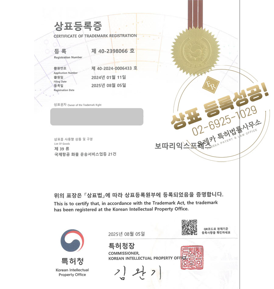상표심사를 통과하여, 최종적으로 39류 상표등록에 성공하였습니다!