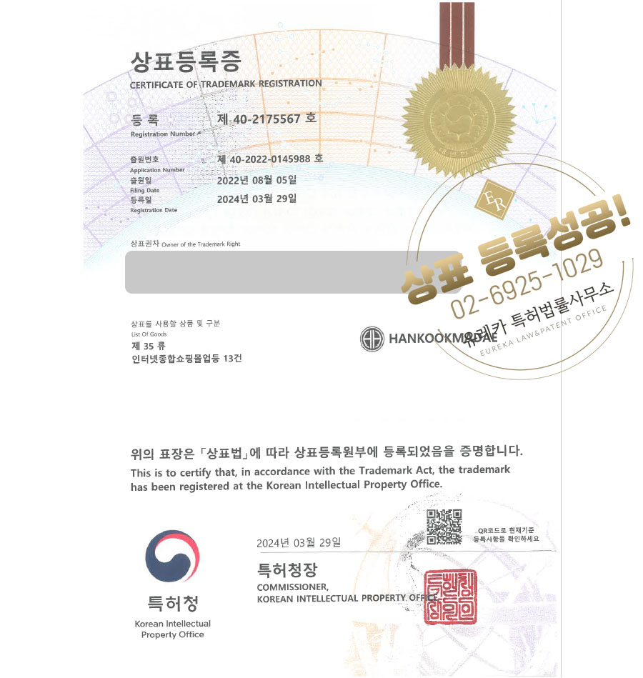 상표심사를 통과하여, 최종적으로 35류 상표등록에 성공하였습니다!