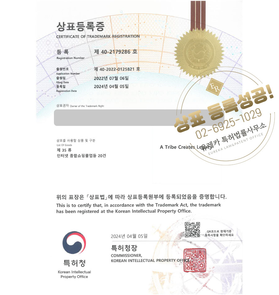 유레카 상표등록 성공! 모자도소매업 상표출원 “A Tribe Creates Legacy” 모자, 볼캡, 야구모자, 캡모자, 의류, 의류소품, 패션 상표권등록